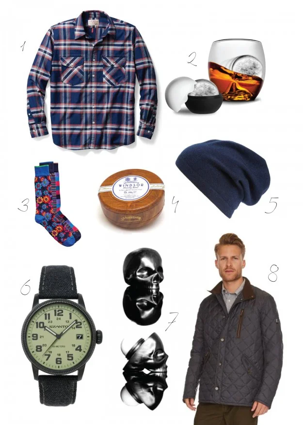 1. Cascade shirt: Filson *available at Canadian Tire 9940 MacLeod Trail S. Calgary 2. Whiskey ice balls: Canadian Tire 3. Duchamp dress socks: Harry Rosen 4. D.R. Harris Windsor shaving soap in mahogany bowl: Kent of Inglewood 5. Cashmere knit cap: Nordstroms 6. Szanto 1000 series 1005 watch: Army Surplus 7. Capital vices collection lip balm: Rebels Refinery 8. Otterdon quilted jacket: Barbour